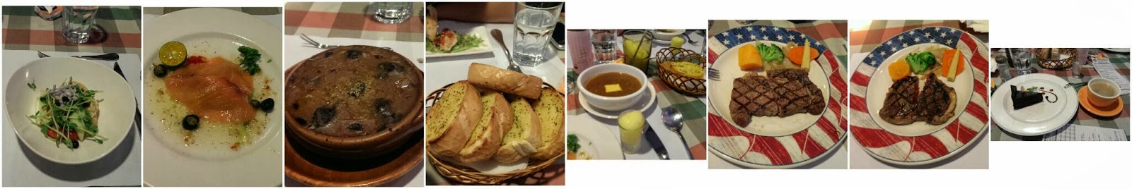 再來說說菜色吧,沙拉(水果)與前菜(煙燻鮭魚)表現的都不錯,新鮮又美味。洋蔥湯與大蒜麵包也是香脆濃郁,但是主菜...就令我大失所望了,雖然用的是磁盤,雖然上牛排前有對切試熟度,爸特...吃到最後牛排明顯過老,顏色都已經變成熟豬肉色了,連愛吃牛排的同學都說...咦...你肉的顏色怎麼怪怪的?!
