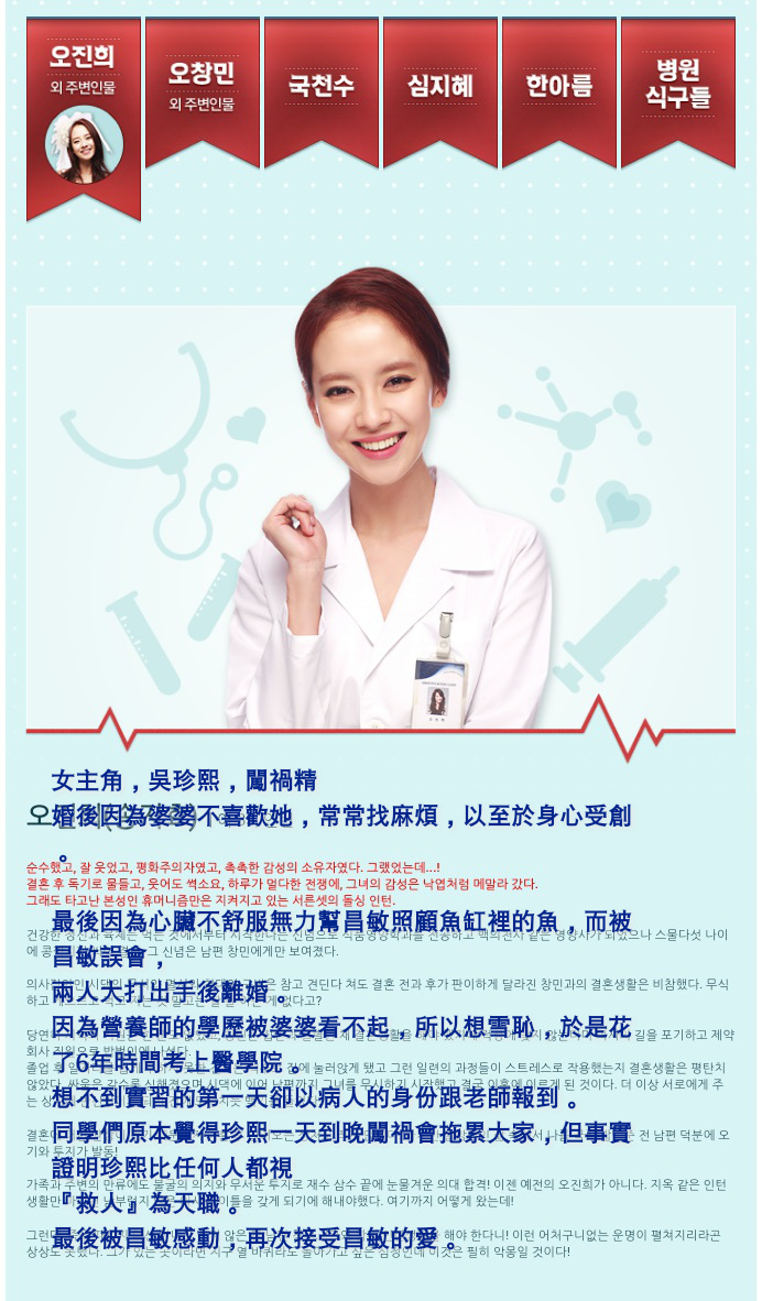 第二女主角~由Clara飾演。劇中的角色是個善良沒心機的實習醫師。