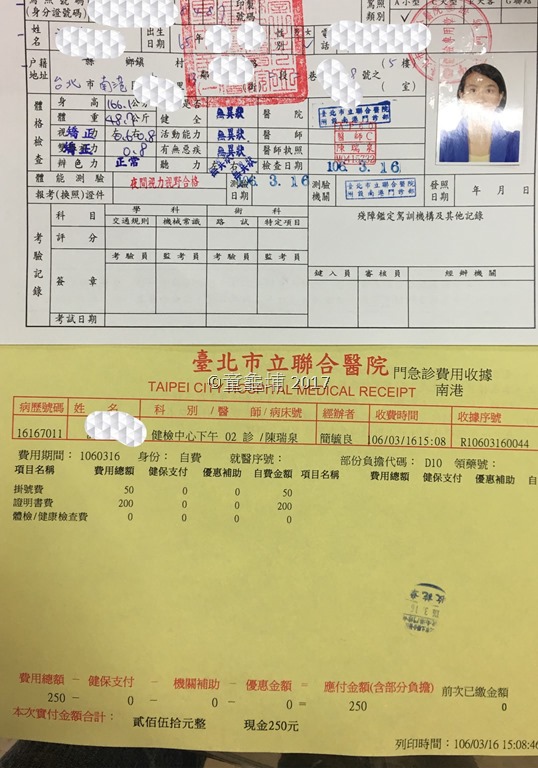 下課後被櫃台小姐要求馬上去做體檢,於是小瑰又從駕訓班走到行政中心,做好體檢再走回來交報告,再走回去行政中心搭車,今天一整個鬼打牆,簡直變成動力火車忠孝東路走九遍了。話說這體檢項目的夜間視力檢查也太機車了吧!在那麼小的視線範圍內亮燈照著你的眼睛,叫你看出方向是怎樣...小瑰陪阿童開車千百回也從來沒有看不清楚過...用這種方式來決定你能不能開車,似乎有點...落伍了吧!不過有個小訣竅就是了,圖卡是重複的,想辦法背起來就對了。